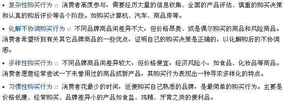 從上面可以見到,我們根據購買者的參與程度和產品品牌差異程度可以區分出四種購買類型: